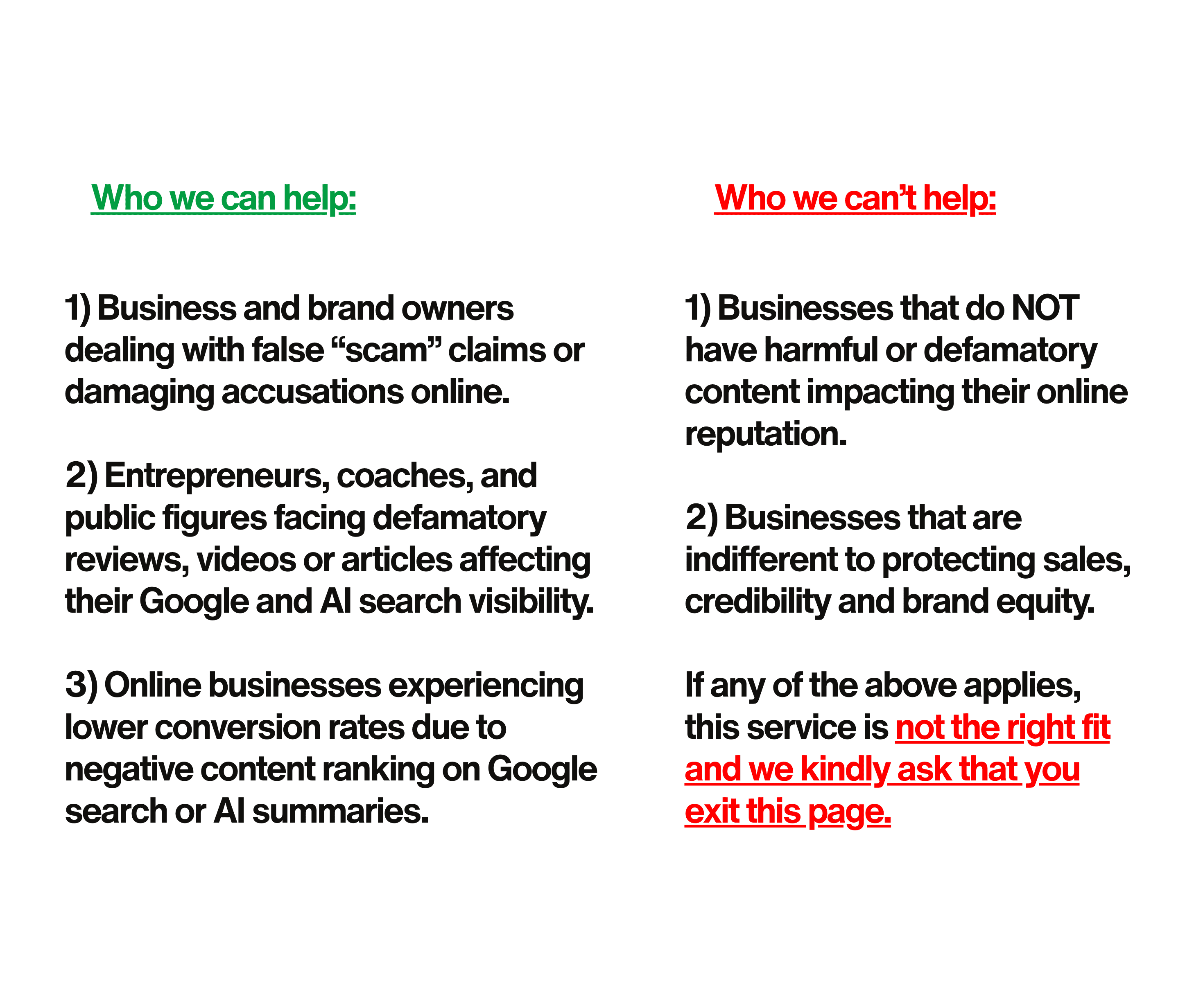 Disclaimer: We are not affiliated with Meta or Facebook. We provide advisory support only, and results depend on decisions made by third-party platforms. Nothing on this page guarantees the removal of content or improvements in business performance. Results vary by case.